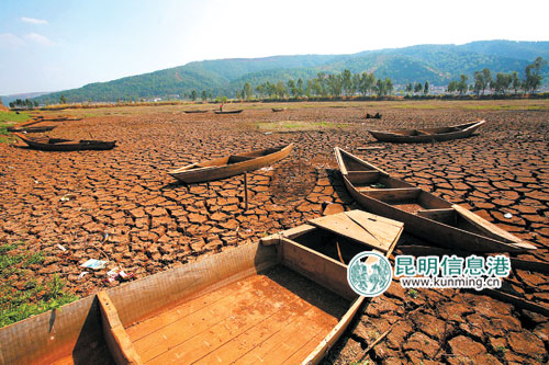 ????由于三年連旱,作為珠江水系南盤江支流的河源——紅河州石屏縣赤瑞湖也未能躲過“劫難”,徹底干涸見底并呈現(xiàn)出了龜裂狀。其下游的云南第四大湖泊異龍湖的蓄水量也只有豐水期的三分之一,湖里許多小魚都已經(jīng)干死。