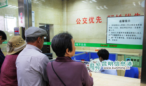 ????楊樹英老人專程從吳家營趕到小西門?!拔液茉缇统鲩T了,搭乘12路公交車再轉(zhuǎn)乘56路公交車到此?!睏顦溆⒄f,去年她辦過一次,因為證件不齊,沒辦成。昨天,她把身份證、云南省老年人優(yōu)待證通通揣在兜里。