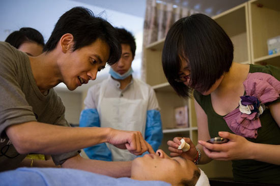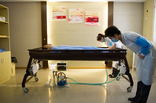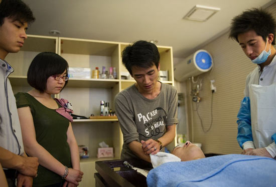 ?????5月10日,在入殮服務(wù)練習中,黃吉盛(左一)在指導學員季爍紅(右)為“往生者”(模特)化妝。 “這是一種體驗,以后真正進行的時候,他們會知道怎樣做才最好,入殮師的每個動作都要體現(xiàn)對生命的敬重”。圖片來源:新華社