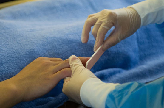 ???? 5月10日,在入殮服務(wù)練習中,林沛潔為“往生者”(模特)修剪指甲。其中一個學生寫到:我們承載的是逝者給生者的回憶,是生者對逝者的救贖。這也是逝者一生中最重要的時刻——干干凈凈地來,漂漂亮亮地去。圖片來源:新華社