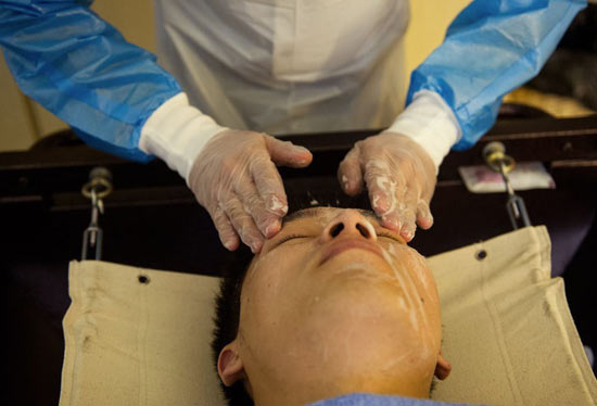 在入殮服務(wù)練習中,入殮師張柏成在為“往生者”(模特)清洗面部。圖片來源:新華社
