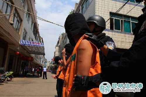 ????2011年12月2日凌晨,居住在宜良縣的李女士半夜驚醒,兩名蒙面男子闖入其家中?!鞍阎靛X的東西交出來?!眱擅凶訍汉莺莸卣f,還不住地?fù)]舞著手中的刀恐嚇李女士,隨后從搶走了價(jià)值6000余元的財(cái)物。案件發(fā)生后,宜良縣公安局立即展開了調(diào)查,一個(gè)以趙佑云為首的41人涉黑犯罪團(tuán)伙“青龍幫”逐步浮出了水面。5月24日,該團(tuán)伙18名成員指認(rèn)了犯罪現(xiàn)場(chǎng)。