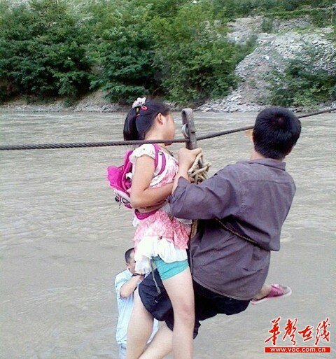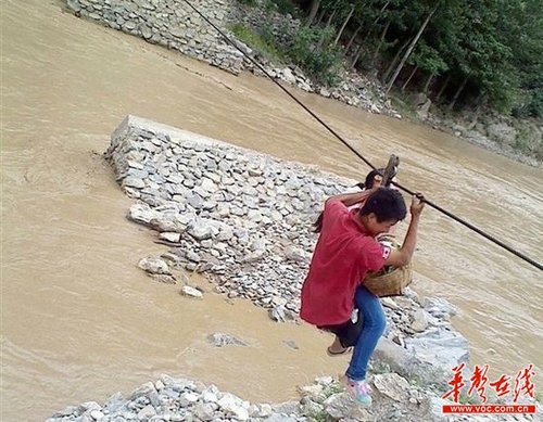 ????網(wǎng)友所附圖片顯示,在湍急的河水中,一根略帶銹跡的鐵索橫跨兩岸,岸邊屹立的兩座橋墩顯示,這里曾有一座橋梁。一位背著書(shū)包的小女孩,在大人的保護(hù)下,正從劃索的一端,滑向河岸的另一邊。而這個(gè)過(guò)程中,除了系在兩人腰部的一根繩索,并沒(méi)有其它保護(hù)措施。不少網(wǎng)友看見(jiàn)圖片后,直呼驚心。