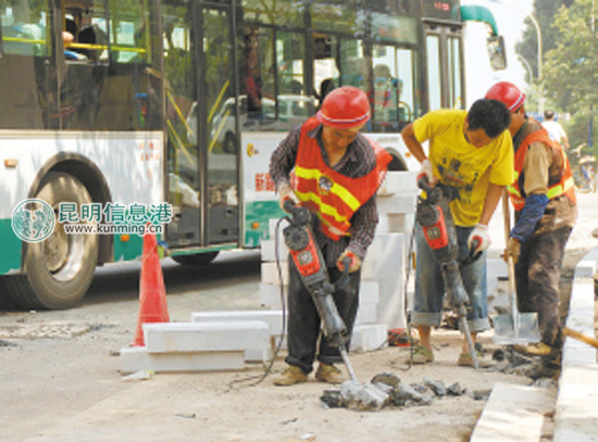 ????昨日,環(huán)城南路上,4臺(tái)大型機(jī)械轟隆作響,進(jìn)行著人行道路的破拆工作。巨大的聲音讓過(guò)往的市民捂著耳朵繞行,但現(xiàn)場(chǎng)的施工人員仍然堅(jiān)持著清理路面、鋪設(shè)人行道。