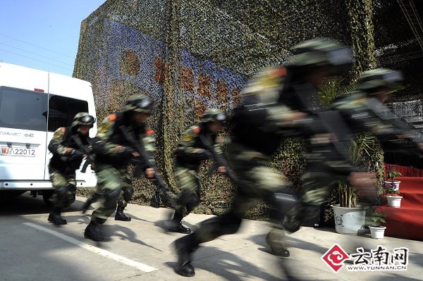 ????云南網(wǎng)訊(記者 楊之輝 通訊員 郝亞鑫 陳世亮)近日,武警云南總隊(duì)基層建設(shè)會(huì)議在昆明召開,會(huì)議期間,總隊(duì)組織全體與會(huì)代表參觀了曲靖支隊(duì)某中隊(duì)縣(市區(qū))反恐分隊(duì)?wèi)?yīng)急科目演示。