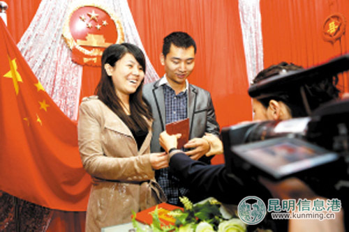 ????“從今天開始,我們將共同肩負起婚姻賦予我們的責任和義務(wù),上孝父母,下教子女,互敬互愛?!边@是準新人潘婷和楊冰峰結(jié)婚登記時的誓言。昨天是周末,適逢一年一度的光棍節(jié)。在這個特殊的日子里,五華區(qū)政府政務(wù)服務(wù)中心工作人員放棄休假,為27對新人辦理了結(jié)婚登記。