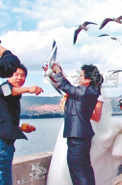 ????昨日,彩龍論壇(bbs.clzg.cn)曬出了一張“一對(duì)新人捕海鷗留影”的照片,從照片上看,新郎抓了一只海鷗,新娘緊挨著他合影拍婚紗照。記者了解到,昆明市禁止抓捕海鷗,市民發(fā)現(xiàn)有人傷害海鷗,可以直接撥打110報(bào)警。