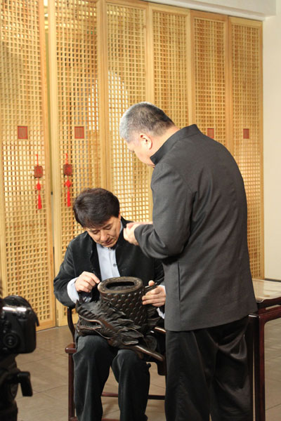 ????作為《十二生肖》電影最重要的道具十二獸首的設(shè)計(jì)過(guò)程也頗為曲折。力求完美、精致、以做藝術(shù)品的心態(tài)來(lái)看待這些道具的成龍找來(lái)了合作過(guò)30多年的美術(shù)大師負(fù)責(zé)獸首設(shè)計(jì)工作。自2008年到2011年初,耗時(shí)兩年多獸首也才只設(shè)計(jì)出一個(gè),并親自到保利博物館與真品比對(duì)。節(jié)目現(xiàn)場(chǎng),成龍也帶來(lái)了其中一件龍首,馬未都評(píng)價(jià)對(duì)其給予了較高的評(píng)價(jià):“與真品相似度90%以上?!蓖瑫r(shí),馬未都調(diào)侃道:“如果這個(gè)突然出現(xiàn)在歐洲鄉(xiāng)間某古堡,所有人都會(huì)覺(jué)得是真的。我再給你磨磨?!?成龍笑道:“你早說(shuō),那我再做幾個(gè)?!?/p>