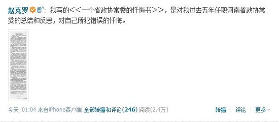 ????昨日,趙克羅在微博中“懺悔”,他原認為自己是政協(xié)委員,有權對政府進行民主監(jiān)督。這半年來他一直后悔自己的行動,“我是太天真太幼稚了”。