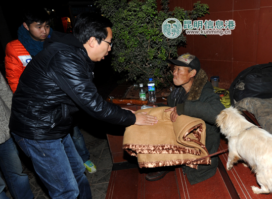 西山區(qū)民政局工作人員為流浪老人送毛毯御寒。記者周密攝