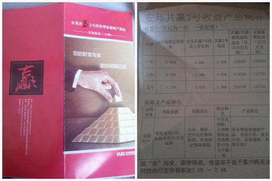 ????銀行所出示的宣傳單頁只是簡單說明了期限以及收益情況,沒有標明是保險產品,加之有銀行的工作人員進行推薦銷售,很容易讓儲戶誤以為是銀行自己的理財產品。而由于目前國家規(guī)定不能出現(xiàn)“保本保息”等字樣,合同上無法明確只能由工作人員做出口頭承諾,對此,記者表示疑問,既然合同上沒有寫明保本保息又如何相信銀行工作人員所做出的口頭承諾呢?