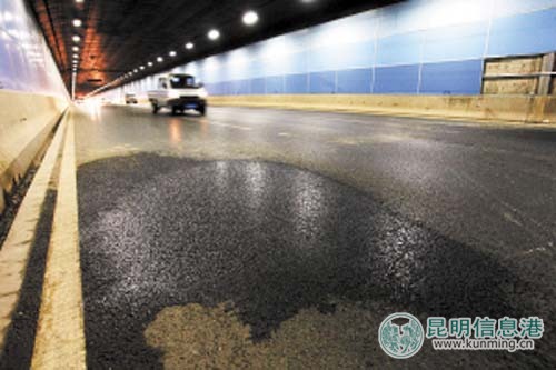????在草海隧道馬街往滇池路方向距出口100多米的地方,隧道頂部有兩處不停有滴水,對應的地面上已被水浸濕。