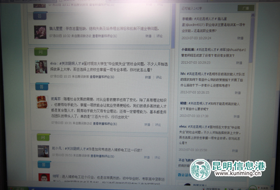 ????昆明信息港訊 記者樊炫 曹帥軍,80年代出生,不僅是一名高級(jí)技師,還是一名大型企業(yè)副總,這些在普通人眼中至少需要20、30年才能辦到的事,他只用了10年便全完成了,他究竟是如何做到的?今天上午,昆明市人才工作領(lǐng)導(dǎo)小組辦公室聯(lián)合彩龍社區(qū)、騰訊微博開展“昆明人才系列微訪談”第一期欄目——80后昆明維修電工高級(jí)技師曹帥軍的成長勵(lì)志路。在一個(gè)小時(shí)內(nèi),昆明高技能人才的代表曹帥軍與網(wǎng)友們暢聊了他的職業(yè)生涯,為大家講述了一個(gè)憑著自身努力走上事業(yè)成功之路的勵(lì)志故事。