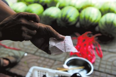 瓜農(nóng)向記者出示當(dāng)?shù)爻枪苤敖o他開的擺攤收據(jù)。 京華時報 記者潘之望/攝