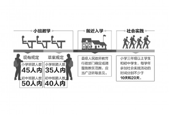 ????此外,草案還擬規(guī)定中小學(xué)禁設(shè)重點(diǎn)校、重點(diǎn)班;推進(jìn)小班教學(xué),逐步實(shí)現(xiàn)小學(xué)35人以下、初中40人以下編班;小學(xué)三年級(jí)以上學(xué)生和初中學(xué)生每學(xué)年參加社會(huì)實(shí)踐活動(dòng)的時(shí)間分別不少于10天和20天等。一旦確定入法,都將對(duì)義務(wù)階段教育產(chǎn)生不小的影響。