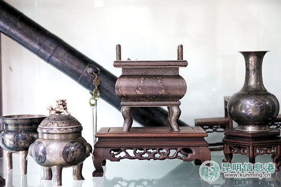 ????從那以后,老金的思路終于換了過來。如今,他開了公司,收了6個徒弟,對照“云南烏銅走銀”六個字,他把徒弟們的藝名命為“金云、金南、金烏……”他說,他還要再收8個徒弟,湊成14個,剛好對照他的公司“云南烏銅走銀文化產(chǎn)業(yè)有限公司”。那么,徒弟的藝名,最后三個就變成“金限”、“金公”和“金司”了。