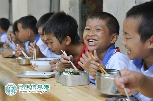??? 肉是山里孩子過年才能有的享受,新廚房落成的第一天就讓孩子們吃上了肉,吃著肉的孩 子們樂開了花