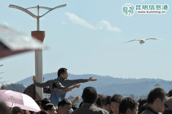 前來(lái)海埂大壩喂鷗的市民很多 記者楊賦/攝