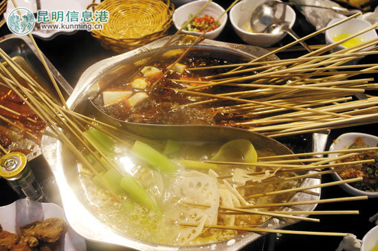 ????串串香到了云南,根據(jù)云南豐富的蔬菜和葷菜資源,越發(fā)具有了它獨(dú)特的魅力;進(jìn)到小店,看著琳瑯滿目的菜品,忍不住什么都想抓一把:海帶、土豆、肉片、花菜、萵筍、毛肚、香腸、魷魚、冬瓜、黃臘丁、貢菜、海白菜、魔芋、黃花、藕、空心菜、排骨等等,無論葷素,一毛錢一串,朋友家人三三兩兩圍著小桌,各拿一大把自己愛吃的串串煮進(jìn)鍋里,煮菜的空檔,還可以嗑嗑瓜子、喝喝冰鎮(zhèn)啤酒、擺擺龍門陣。