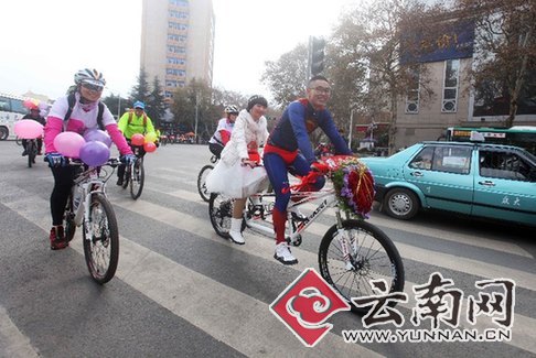 ????每個(gè)女孩都有一個(gè)夢(mèng)想,那就是舉辦一場(chǎng)浪漫而又有紀(jì)念意義的婚禮。而昨天,昆明一對(duì)小年輕就舉行了這樣一個(gè)既浪漫又環(huán)保的自行車騎行婚禮,這不僅讓他們畢生難忘,也羨煞不少的小伙伴,小伙伴們都表示將來(lái)也要辦一個(gè)像這樣有意義的婚禮……