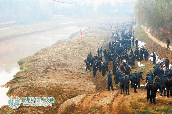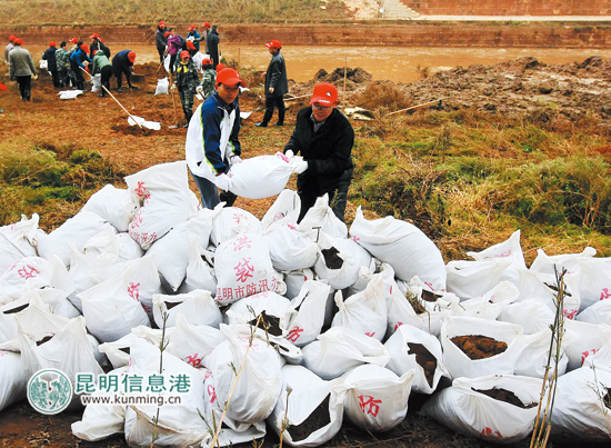 ????昨日上午9點(diǎn)半,在祿勸掌鳩河縣城段的東山橋邊,“保護(hù)母親河 全民共參與”、“加強(qiáng)河道綜合整治 創(chuàng)和諧人居環(huán)境”等標(biāo)語懸掛在掌鳩河河道兩側(cè),此時的氣溫只有0攝氏度,寒意十足。掌鳩河一邊的堤岸上,卻是一派熱火朝天的場面:數(shù)百名祿勸干部職工頂著寒風(fēng),奮力揮下手中的鋤頭,將河岸中常年淤積的泥土挖起,裝入防洪袋中堆放到岸邊,每個人都積極投入、干勁十足。據(jù)了解,全縣3000余名干部職工分為4組,分別在兩天時間里分段完成清淤工作。祿勸縣水務(wù)局局長李庭裕介紹:“本次進(jìn)行的掌鳩河清淤活動,是多年以來規(guī)模最大的一次,主要通過機(jī)械挖掘,在枯水期內(nèi)抓緊清理河底淤泥,明年春節(jié)前,完成掌鳩河縣城段3公里和南塘河1公里河道內(nèi)7.2萬立方米淤泥清除,掌鳩河縣城段的防洪、泄洪能力將大大提高?!鼻逵俟ぷ魍瓿珊?,祿勸將投資800余萬元,在掌鳩河?xùn)|山橋邊建起一座如同瀑布的景觀閘門,通過調(diào)整、控制河流水位,屆時將形成掌鳩河縣城段10余公里綠化長廊及河道“水清岸綠”的靚麗景觀。
