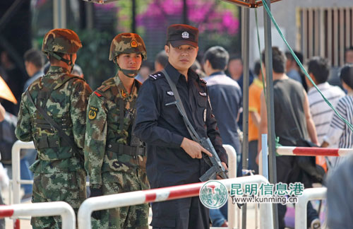 在昆明火車(chē)站警察與武警共同值守保平安。記者李海曦/攝