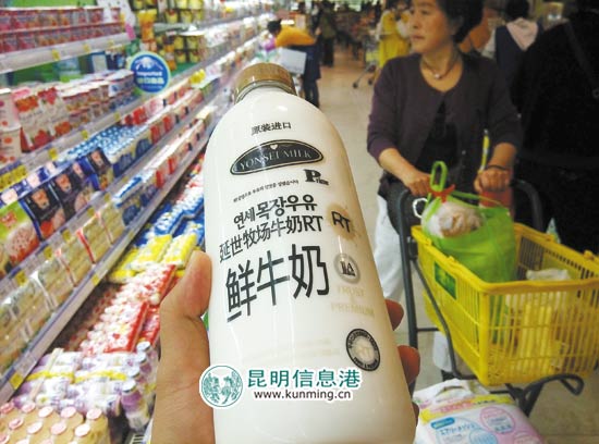 ????5日,在百盛超市的冷藏乳品區(qū),記者看到除了常見的進口常溫奶外,進口“家族”中又添新成員。一瓶瓶滿身韓文的進口冷鮮奶吸引了不少消費者的注意,冷藏柜里的進口鮮牛奶都來自韓國,1L裝的韓國延世鮮牛奶售價為47.5元/瓶,223ml的小瓶裝價格也在16.8元。