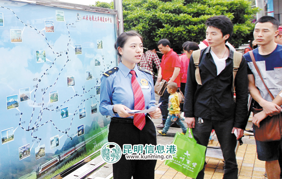 ????昆明鐵路局收集了從昆明始發(fā)的各趟列車沿線的景點資料,設(shè)計制作出精美的鐵路旅游攻略圖,讓旅客輕松成為鐵路旅游達(dá)人。 記者趙偉/攝