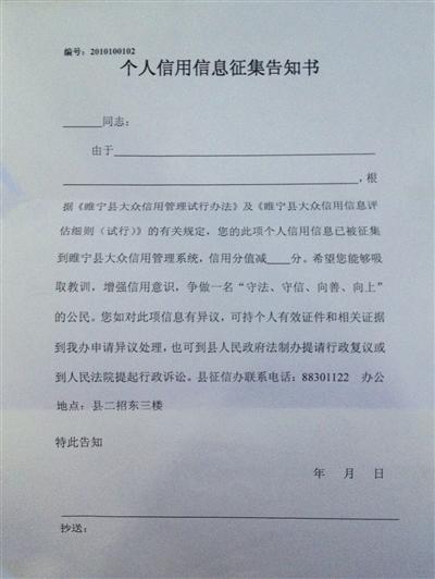 睢寧縣稱,征信辦設置了征信通知個人的環(huán)節(jié),但實際操作中,對被加減分的個人,“未全部通知”。