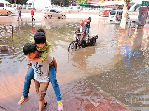 ????昨日一場短時(shí)降雨過后,巫家壩、東郊路等地路段再次水淹成河,面對翻滾而來的臭水,三輪車的生意好做了。三輪車夫說,“下面的水管吃了個飽,我們就可以多拉幾個掙點(diǎn)錢了?!?/p>