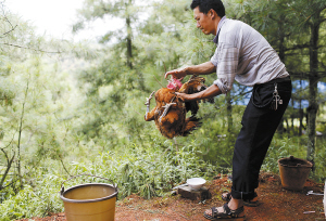 ????上山第一天,最重要的事情是要祭山宴客。祭山由家里的長輩完成,6日清晨,李有紅一家便早早來到山上,準(zhǔn)備好公雞和清香,等待80多歲的老母親上山祭祀,祈求風(fēng)調(diào)雨順。