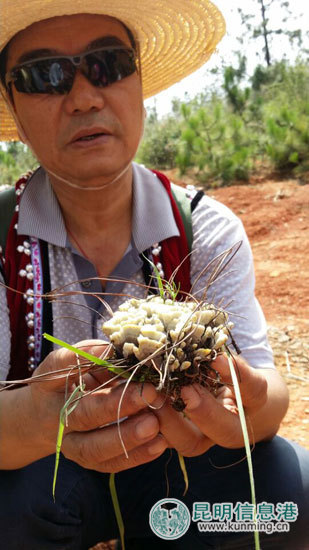 ????來到易門縣浦貝鄉(xiāng)的后山,經(jīng)過一段盤旋崎嶇的山路,終于到了野生菌采集體驗點,密密匝匝的松針、肆意生長的野草,高大的松樹,形成了野生菌生長的基本條件。當(dāng)?shù)厝私榻B,這里從5月2日到6月5日都沒有雨,久旱逢甘霖的易門,終于挺過來了,再次以豐富的菌種和數(shù)量迎接八方來客。????撥開濃密的草叢,仔細(xì)找尋菌子的蹤影,有經(jīng)驗的采菌人深知菌子在什么地方,滿載而歸。完全沒有經(jīng)驗的人們來到這里,總是對一切都充滿了好奇,好像處處都有菌,用木棍子扒拉開了卻什么都沒有。長期在城市生活的人們,即使撿不到菌子,聞慣了汽車尾氣和二手煙,大可到此地舒心地享受天然大氧吧帶來的野趣。