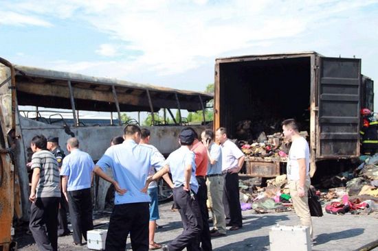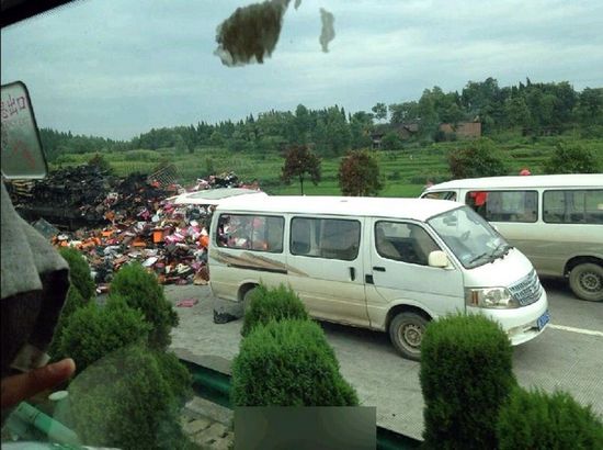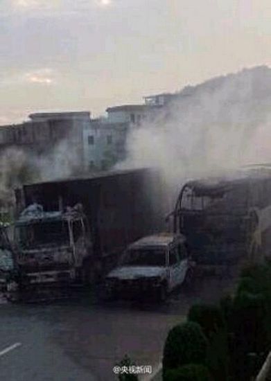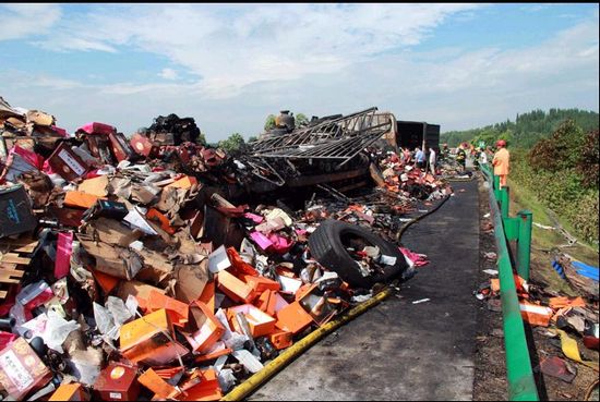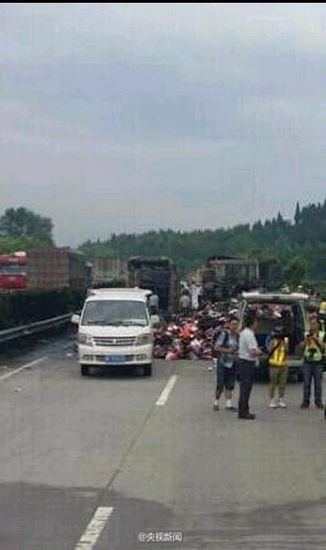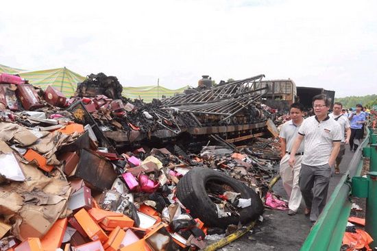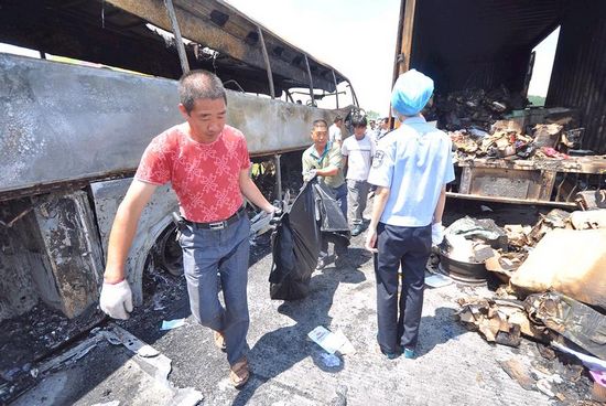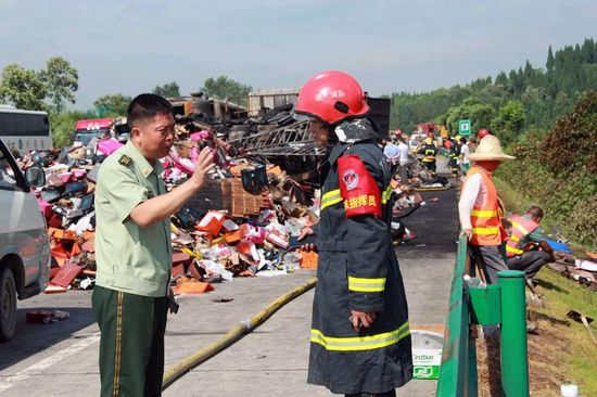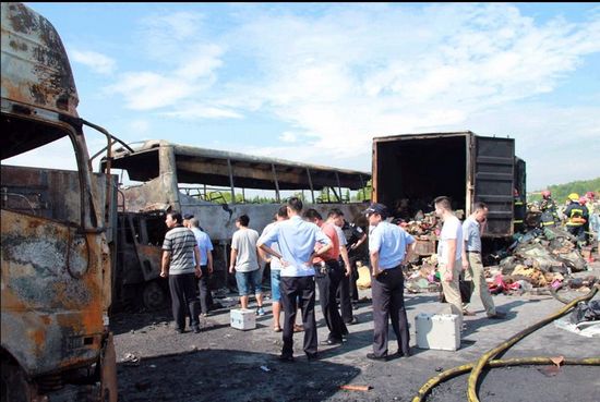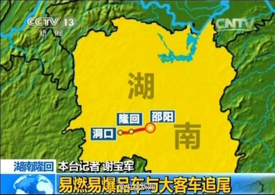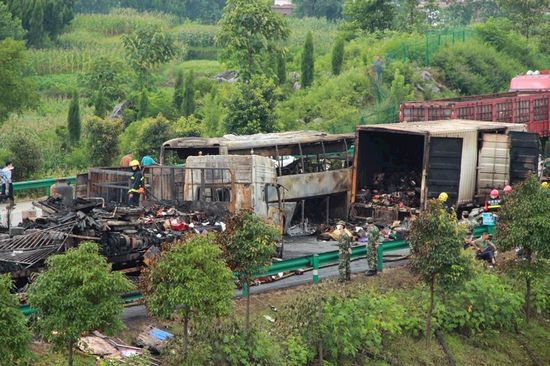 ? 2014年7月19日凌晨3點左右,湖南滬昆高速隆回到洞口段發(fā)生交通事故,一疑似裝有易燃易爆品的小貨車與一輛從福建開往貴州的大客車相撞,發(fā)生爆炸燃燒,或有重大傷亡。大客車核載53人,4人逃出,但嚴(yán)重?zé)齻,F(xiàn)場有刺鼻氣味。
