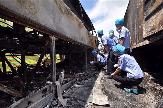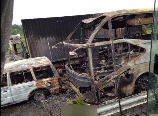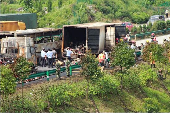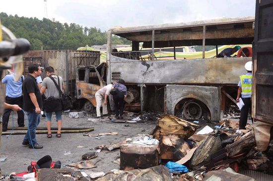 ? 現(xiàn)場救援指揮部通報,事故共造成5車燒毀:①閩BY2508大客車(核載53人) ②粵F08030三菱小客車 ③湘A3Z746廂式貨車(裝載疑似酒精易燃品,裝載物品已全部燒盡,司機(jī)和乘客共2人已遇難) ④湘A98206大貨車 ⑤贛E38950大貨車。