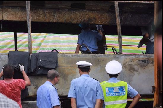 ? 2014年7月19日凌晨3點左右,湖南滬昆高速隆回到洞口段發(fā)生交通事故,一疑似裝有易燃易爆品的小貨車與一輛從福建開往貴州的大客車相撞,發(fā)生爆炸燃燒,或有重大傷亡。大客車核載53人,4人逃出,但嚴(yán)重?zé)齻,F(xiàn)場有刺鼻氣味。圖為事故車輛被燒得僅剩鐵架。