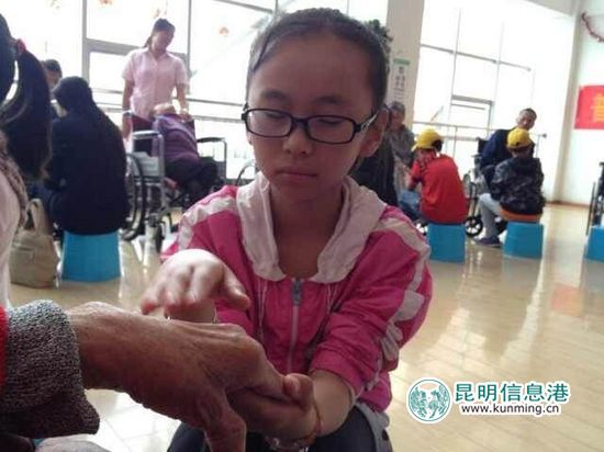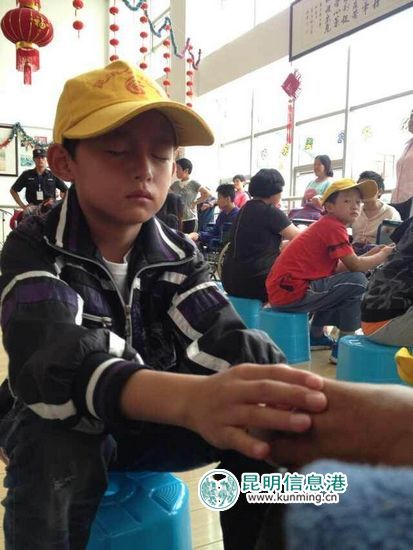 ????“爺爺,請(qǐng)您過來這里坐,我們先為您測視力,稍后醫(yī)生會(huì)給你們做更詳細(xì)的檢查?!?月4日—5日,昆滇小記者們跟隨昆明普瑞眼科醫(yī)院的醫(yī)務(wù)人員,來到昆明市社會(huì)福利院為這里的孤寡老人、殘障人士義診。孩子們自由結(jié)合成小組,分工協(xié)作,有的攙扶老人,有的為老人幫椅子,有的測視力。雖然非“科班”,但在普瑞眼科醫(yī)院醫(yī)生的指導(dǎo)下,小記者們都將自己的工作做得有模有樣?!盃敔?,你的視力左右眼都是0.6,平時(shí)眼睛有沒有不舒服?如果眼睛干澀這里有眼藥水哦!”在為老人義診的同時(shí),孩子們?nèi)圆煌P(guān)心他們。當(dāng)孩子們發(fā)現(xiàn)其中一位爺爺?shù)囊暳_(dá)4.6時(shí),紛紛圍住爺爺,采訪他平時(shí)怎樣保護(hù)眼睛。