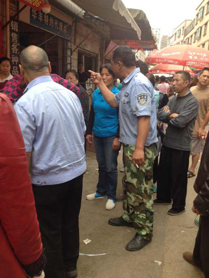 ????隨后,在該市場管理辦公室,記者找到了網(wǎng)友圖片中所提到的那兩位穿制服的男子。原來,那位背對鏡頭的中年男子叫保明愛,是市場辦公室的負責人,其著裝跟事發(fā)當天一樣,上衣袖標有“治安”字樣。那位穿迷彩褲的男子是這個市場的保安隊長,他穿了一件右胸前印有警徽標志的黑色背心。