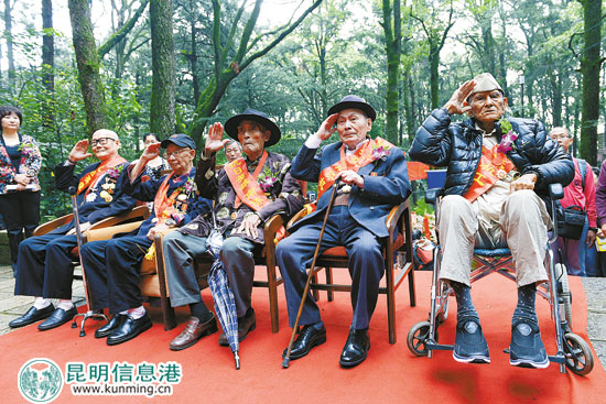 ????在這個(gè)特殊的日子里,翁家貴、李亞留、蔣印生、吳惠民、蘇榮祿等5位南僑機(jī)工和部分來(lái)自海內(nèi)外的南僑機(jī)工后代來(lái)到昆明西山森林公園,瞻仰南僑機(jī)工抗日紀(jì)念碑,回顧歷史,緬懷先烈。