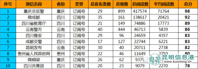 ????昆明信息港訊 記者袁艷 9月1日至9月5日,騰訊網(wǎng)通過對閱讀數(shù)、點(diǎn)贊數(shù)、發(fā)布條數(shù)等指標(biāo)進(jìn)行了統(tǒng)計和梳理,從傳播力、活躍度、觸達(dá)率等維度對西南地區(qū)的政務(wù)微信號進(jìn)行了分析,排出了西南地區(qū)最值得關(guān)注的10個政務(wù)微信號,云南2賬號上榜。
