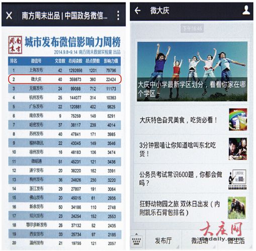 ????9月17日,南方周末“中國政務(wù)微信排行榜”首期周榜單上,“微大慶”影響力排名第二。榜單顯示,從9月8日到14日,全國130個省、市(地級市)城市發(fā)布類微信號中,“微大慶”的影響力值為22424,比第三名高出1000多點。