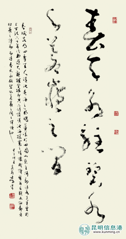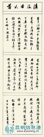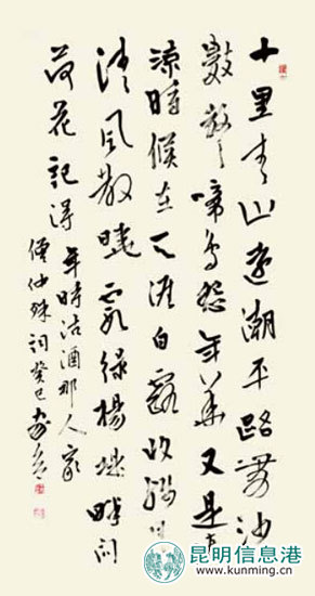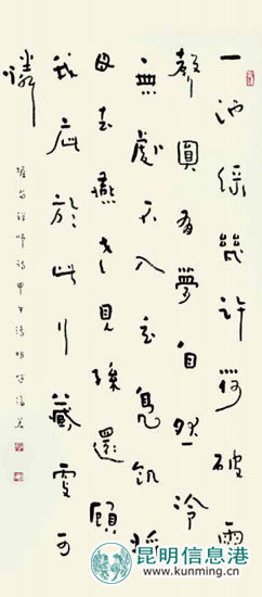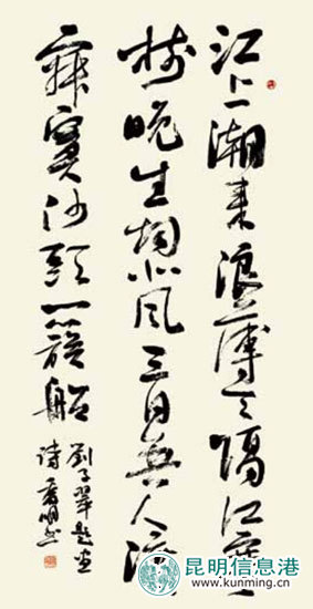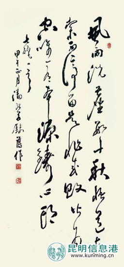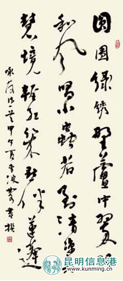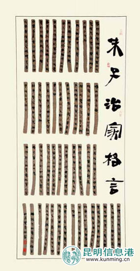 昆明信息港訊 為了慶祝中華人民共和國成立六十五周年,昆明書畫院在紅洋藝術畫廊舉辦“蘊跡”書畫展,共展出55幅美術以及書法作品。展覽取名“蘊跡”,“蘊”為積蓄,“跡”表心聲,包含了30多位云南昆明藝術家“追尋中國夢”藝術道路上走過的痕跡。