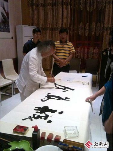 ????冰島之行結(jié)束后,張?zhí)煜柙谠颇想p龍古茶園商貿(mào)有限公司董事長楊加龍的帶領(lǐng)下參觀了即將建設(shè)完工的“國際冰島茶城”。張?zhí)煜鑼﹄p龍出品的“勐康”普洱茶做出了由衷地贊許,盡興之余,他揮毫潑墨,即興創(chuàng)作了數(shù)幅充滿激情的書法作品作為留念。(記者 趙崗 通訊員 張耀輝)
