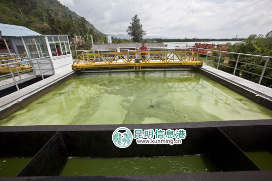 滇池龍門藻水分離站,收集的藍(lán)藻在車間進(jìn)行分離 資料圖片