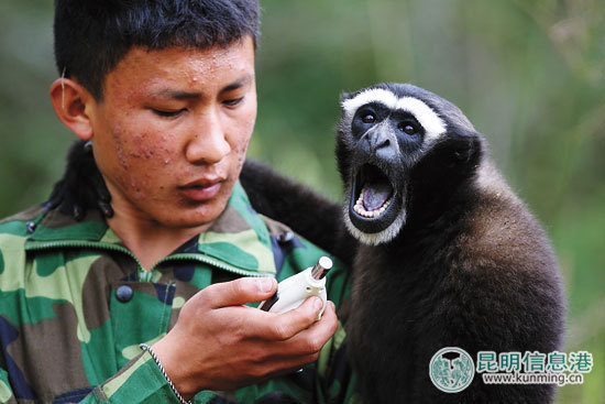????接著,采集小組來到長臂猿棲息地。當(dāng)天對棲息地的其中4只長臂猿的血壓、臂力、智力進(jìn)行了測試。測試由常年給長臂猿提供人工補(bǔ)給的觀察員金工文配合進(jìn)行。