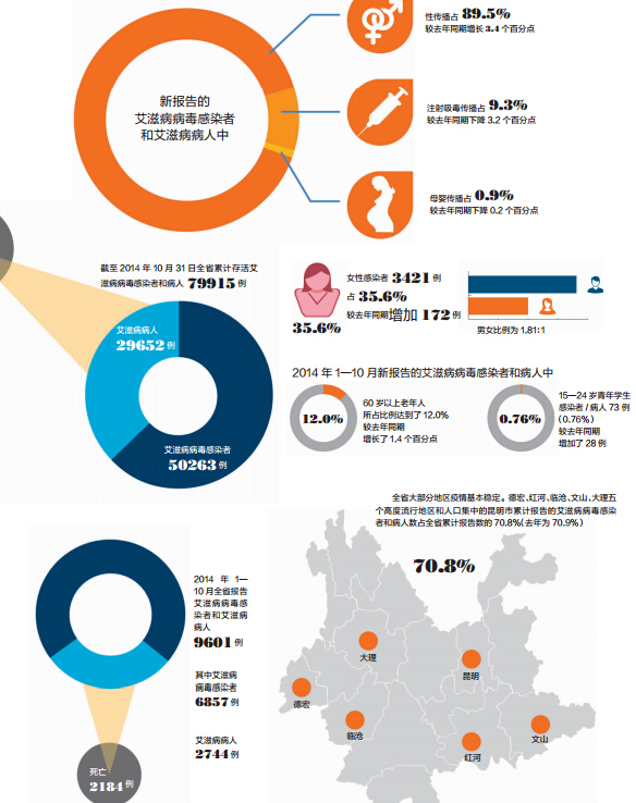 ????據(jù)云南省衛(wèi)生和計劃生育委員會副主任、云南省防治艾滋病局局長徐和平通報,2014年1-10月,全省報告艾滋病病毒感染者和艾滋病病人9601例,其中艾滋病病毒感染者6857例、艾滋病病人2744例,死亡2184例。