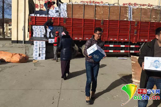 2014年11月26日遇難當(dāng)天,袁雅遜在道孚縣受災(zāi)地搬運(yùn)物資場(chǎng)景。 共青團(tuán)甘孜州委供圖