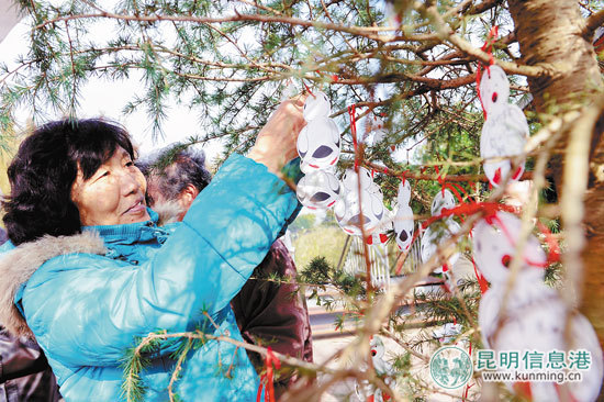 ????市民把祝福語掛在“海鷗樹”上。記者王一帆攝