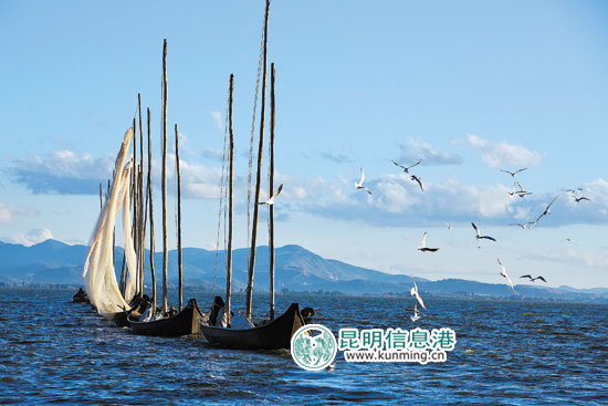 ??? 夕陽西下,紅嘴鷗在帆船周圍飛舞。滇池里捕魚的漁民將升起的漁網(wǎng)曬干,這樣上岸即可保存 記者孟祝斌/攝