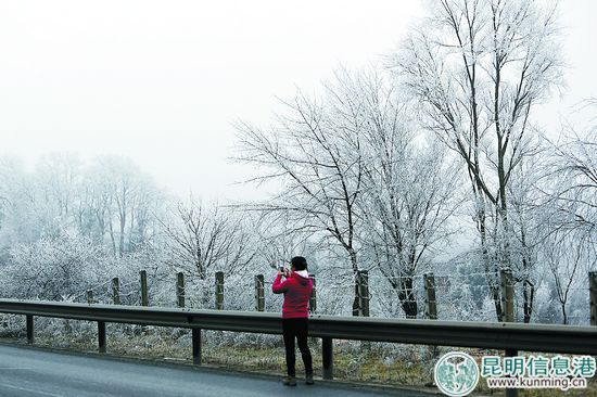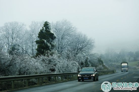 昆明“兩區(qū)”、尋甸縣、東川區(qū)等均屬昆明北部山區(qū),上午9點(diǎn),記者沿倘甸到尋甸的老路一層層翻越埡口的過程中,當(dāng)車行駛到2500米時(shí),車外景色由蒼綠色變成灰白色,到了2600米,又變成白色。每棵樹的樹冠、干枯的樹枝、灌木的小葉片上,都覆蓋了一層白霜,而黑灰色的樹干、大樹枝則依然保持了原來的神色。兩相映襯,像一幅黑白畫卷,煞是美麗。再往海拔2600米以上攀升,景色變成白茫茫的一片,濃霧從山洼、樹冠騰起,彌漫了整條公路,每一輛車都閃爍著警示燈、示廓燈。濃霧中,能見度從80米下降到50米,再下降到30米,最后,閃著應(yīng)急燈都只能以10—20公里的時(shí)速前行。2600米海拔以上的道路并不長,八九公里就開始下坡,越往下白色越少、綠色增多,氣溫也不斷攀升,坐在車?yán)锷斐鍪秩ィ褯]有刺骨的寒冷。