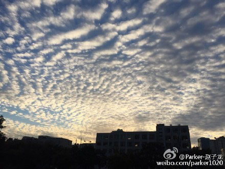 ????昨天早上的朝霞之所以那么好看,還有一個重要因素,就是剛巧遇到天空出現(xiàn)大面積的中層云。在氣象學上,將天空的云主要分為中層、高層和底層云三種?!爸袑釉票旧砭褪且环N氣流波動,其由附近的風不斷的改變而波動,所以如同魚鱗一般,規(guī)則好看?!惫ぷ魅藛T介紹,中層云還是一種透光高積云,所以一旦形成朝霞很是好看。